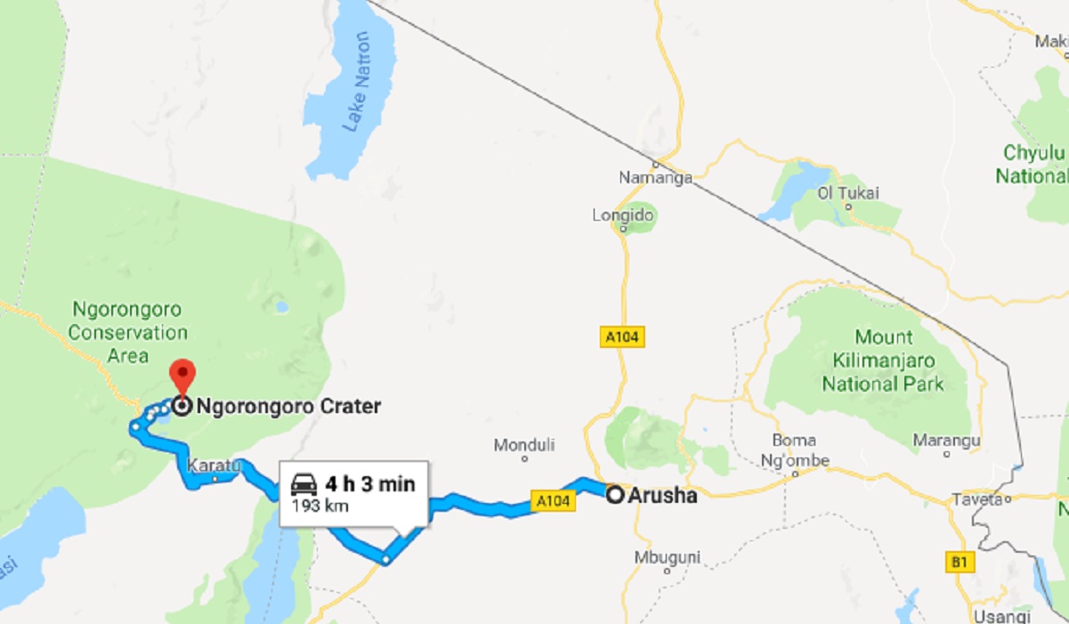 - The distance from Arusha airport to Ngorongoro Crater is about 170 kilometres. That’s about a 3-hour drive by car. There is a newly built highway to all the National Parks so the drive to Ngorongoro is safe and non-adventurous.