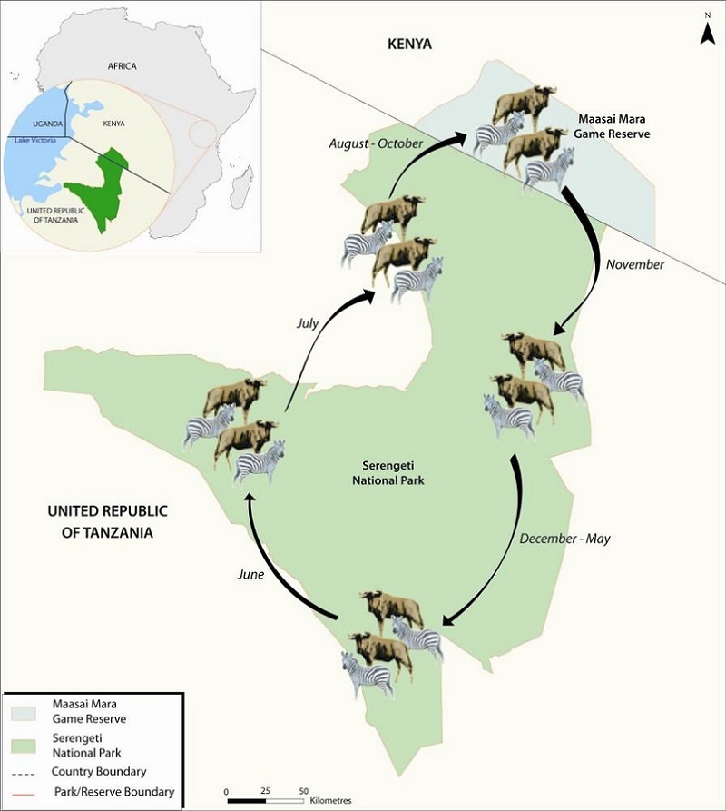In August and September, the central Serengeti dry up and the entirety of the herd arrive in Maasai Mara National Reserve and the northernmost reaches of the Serengeti, past the Mara River. In October and November, the low rains begin and vegetation starts returning to the flood plain in the south. The herd starts to move back south, along the eastern fringes, only to settle in the south for birthing and the long rains of spring.